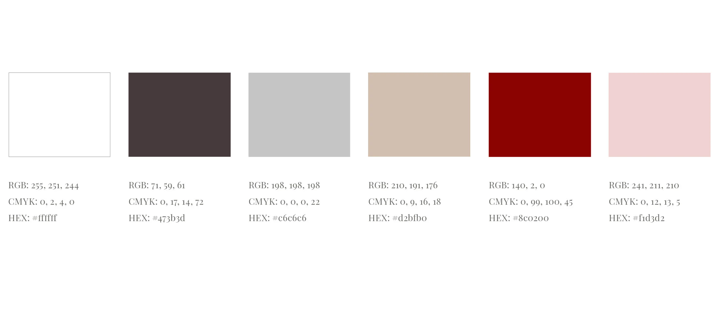 The colour scheme expresses Florence & Vera’s ethos; it’s romantic, sumptuous and fun. White and off-white should be used generously when designing to convey freshness and modernity. The secondary colours can be used to highlight information. They introduce energy and warmth for the occasions when monochrome is too stark. Colours should be used consistently across all brand collateral.